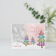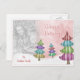 Spread holiday cheer with this cute, fun, custom post card. Various colourful country contemporary Christmas trees decorate a landscape that is home to a holiday message and a family photograph.