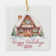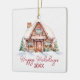 Watercolor Christmas gingerbread man and house with candy canes and Happy Holidays text in snowflakes.