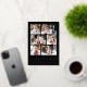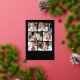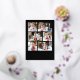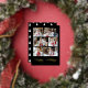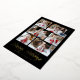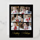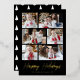 Modern foil holiday card featuring 6 of your photos arranged in a collage layout. "Happy Holidays" is displayed in a handwritten gold foil script with your family name and the year shown below on a black background. The multi-photo holiday card reverses to display a black and white Christmas tree pattern.