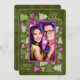 Bold and unique way to send holiday greetings when you add your photo and name to this sage or olive green and purple in faux gold leaf style photo card with Christmas tree border.