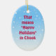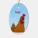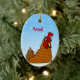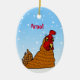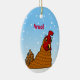This custom ceramic Christmas ornament template has a cute cartoon chicken looking at you curiously. Above the hen, it says, "Aroo!" Chicken lovers know this sound. The back says, "That means 'Happy Holidays' in Chook." The background is blue sky and falling snow.