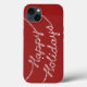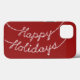 Happy Holidays written in sparkling string lights accent this cranberry red iPhone Case, making it perfect for a gift or winter accessory.