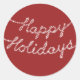 The Happy Holidays sticker, written in twinkle lights on a cranberry red background, adds a festive touch to packages, gifts or envelopes.