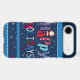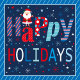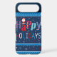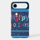 A phone case with a dark blue background, decorated with a festive "Happy Holidays" design. The word "Happy" is written in a playful, colorful font, with each letter having a different pattern: the "H" has red and white candy cane stripes, the "a" is red with white polka dots, the first "p" is red with blue polka dots, and the "y" has blue and white stripes. Above the "a" is a small cartoon Santa Claus figure. The word "HOLIDAYS" is written below in a mix of red, white, and blue letters. The background is filled with white and red snowflakes and stars of various sizes. The top and bottom edges of the case have a decorative border of blue stripes and small white stars.