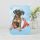 Celebrate the holiday season with a cute Miniature Pinscher puppy in a Santa hat amid snowflakes with the words, Happy Howlidays on the back! Great for Min Pin-loving family and friends.