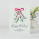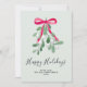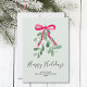 This green holiday card is decorated with watercolor mistletoe, a red ribbon, and stylish script typography that says "Happy Holidays"