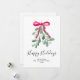 This holiday card is decorated with watercolor green mistletoe, a red ribbon, and stylish script typography that says "Happy Holidays"