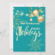 Happy holidays gold ornaments, snowflakes, stringed lights, elegant modern holiday custom green Christmas invitation card.