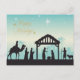 Celebrate the true spirit of Christmas with our “Happy Holidays Nativity Manger Scene” postcard. This elegant postcard features a serene nativity scene silhouetted against a tranquil blue sky that fades into white, symbolising peace and calm on this holy night. The design includes the holy family, the Three Wise Men, a shepherd with his sheep, and a guiding star shining brightly above. The phrase “Happy Holidays” is written in an elegant script, adorned with small stars to enhance the festive feel. Perfect for sending warm wishes to friends and family or as a thoughtful gift, this postcard will surely leave a lasting impression on anyone who receives it.