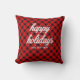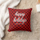 This custom throw pillow features the text "Happy Holidays" on a red buffalo check background. There is also a customisable field for you to add your name or any text you like.
