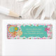 Holiday return address labels with a retro look featuring text that reads "Happy Holidays" as the background with a teal blue frame where you can customise by adding your name and address, snowflakes of orange and pink, and several pretty ornaments!