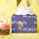 White HAPPY HOLIDAYS text with gingerbread man and snowflakes on PURPLE background.