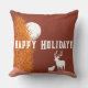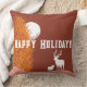 Happy Holidays typography on holiday themed background in brown that includes Christmas Fir trees, moon and the reindeers.