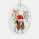 Original fine art ornamnet of a cute Basset hound decorated for Christmas by designer Carolyn McFann of Ornamentation and Two Purring Cats Studio for all who love Bassets this holiday season.