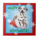 Celebrate the holiday season with a cute Dalmatian puppy sitting in a Santa hat amid snowflakes and the words, Happy Howlidays! Great holiday gift idea for Dal-loving family and friends.