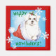 Celebrate the holiday season with a cute Maltese puppy sitting in a Santa hat amid snowflakes and the words, Happy Howlidays! Great holiday gift idea for Maltese-loving family and friends.