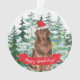 Cute dated Newfoundland Dog Christmas ornament set on a pine & spruce tree background with the holiday message "Happy Howlidays" . Visit our shop to view a large assortment of dog breads