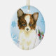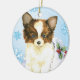 Celebrate the holiday season with a cute Papillon puppy in a Santa hat amid snowflakes with the words, Happy Howlidays, on the back! Great holiday gift idea for Papillon-loving family and friends.