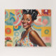 happy black woman in colourful patterns