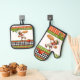 Oven mitt and pot holder set featuring a whimsical colorful illustration of a pizza baker with tomato and basil. Great for anyone who loves the Italian kitchen.