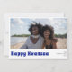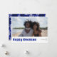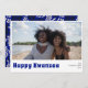 Happy Kwanzaa holiday photo card. Minimalist design with single photo. Back of card features, rustic leaf pattern in blue, black and soft sand.