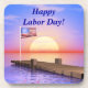 Beverage coaster with my original end-of-summer image of a dock, the American flag, and a setting sun. Customisable text says "Happy Labour Day!"