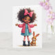 This card shows a cheerful illustrated girl and her long-eared animal friend on a plain white background, keeping all attention on their faces and body language 🐰. The girl has dark, curly hair topped with a large pink bow, and she leans forward with open arms as if welcoming a hug from her companion. She wears a bubblegum-pink jacket with shiny buttons over a soft sky-blue dress, with pink-and-white striped socks leading down to dark boots. Next to her sits a small rabbit-like creature 🐇, smiling up at her with a gentle, trusting look that suggests close friendship. Decorative swirls curl out from her hair, adding airy movement around the two figures without crowding the space. The greeting text is placed near the top in pink, with a smaller line beneath it in light blue. The background stays bright white, with the pink bow and jacket standing out most against the cool blue dress.