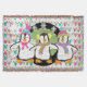 Happy Little Penguins holiday throw blanket features three cute penguins in earmuffs, winter hats, and scarves on a background of white with strings of coloured lights, a strip of solid black with white snowflakes, and a green centre with white polka dots.
