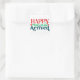 This Happy Mail has Arrived sticke has writing in red, green, and a dark teal. There are hearts and dots to emphasize the happy.