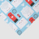 Repeat pattern of kawaii British-style postboxes, letters, stamps, envelopes, paper planes and post marks on a blue background.
