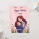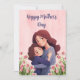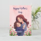 Celebrate Mother's Day in a warm and unique way with this charming greeting card. The design features a beautiful illustration of a mother and daughter in a loving embrace, surrounded by delicate pink tulip flowers and green leaves. The card includes the elegant and script text "Happy Mother's Day" in a lovely blue.