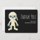 Flat thank You card with a cool Halloween image. A mummy all wrapped up in his bandages. Happy smiling face. A spooky cute adorable creature.