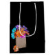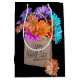 Colourful daisy bouquet in a brown paper sack on black for Name Day
