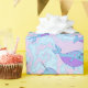 Adorable, chubby narwhals swimming amongst swirling waves on a pink background.