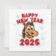 Celebrate the New Year 2026, the Year of the Horse, with this cheerful and bright graphic! It features a happy, cartoon horse mascot in a dynamic vector style. The main colors are vibrant red for the text (Happy New Year 2026) and brown/white for the horse, set against a background of white/gray snowflakes. The target audience includes party-goers, people celebrating the Chinese Zodiac, and fans of cute, festive animal graphics.