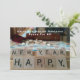 Board game with the words "Happy New Year" spelled out on the wooden block squares. Change the name and message for your own. Fun card has the same word game on the bank of card. Though a different than shown on the front.