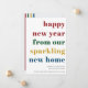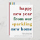 Colourful Happy New Year card which doubles up as a moving announcement card. The bold typography reads "happy new year from our sparkling new home" is lettered in big and bold modern typography and the design can be edited for a single person or a family. You can also add your new address and your name(s). A headline statement design to let everyone know your new address.