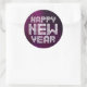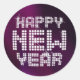Customisable Happy New Year stickers for a sparkling New Year's Eve party with flashy glittering text on silky purple (background colour can be changed).