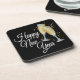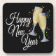 This set of coasters features a black background with the wording: Happy New Year and two champagne glasses and coloful confetti.