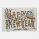 Vintage illustration Happy New Year holiday design originally published by Currier & Ives in 1876 featuring the words "Happy New Year" written in tree branches and decorated with holly, acorns and flowers celebrating all the seasons of the year.