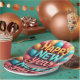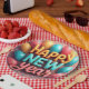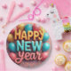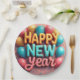 Happy New Year paper plates with balloons and confetti.