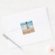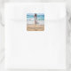 A woman in a flowing white dress strolls along a sandy beach, where 'Happy New Year' is carved in the sand, capturing a serene moment by the ocean
