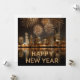 This festive and vibrant image captures a spectacular New Year's celebration with brilliant golden fireworks exploding over a blurred city skyline at night. The cityscape and its reflections glow warmly on the water below. The words "Happy New Year" are boldly displayed in a shimmering gold glitter font, adding a sense of joyful anticipation and sparkle.