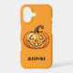 Cute orange cartoon pumpkin illustration with a smiling face expression. There is also a personalizable text area for a name. The orange background colour can be changed to any other colour as well, if so wished.