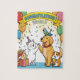 This is a fun and celebratory puzzle featuring a group of happy pets. In the centre, a golden retriever and a white cat, both wearing party hats, are giving each other a high-five. A colourful parrot with its own hat is perched on the dog's head, while a small hamster pops out of a present to the side and a guinea pig holds a mini trophy. The scene is full of confetti and colourful balloons, with a yellow banner across the top that says "CONGRATULATIONS! YOU DID IT."