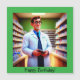 This birthday card features a happy pharmacist on the job at the pharmacy.