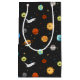Cute happy planets, suns, moons, stars and shuttle in outer space.