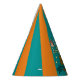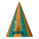 Adorable fun birthday party hats to brighten up your party. Over an orange background the design starts from the top with Happy Birthday in green and yellow text with a cake with pink icing and three lit candles next ti the H in happy. Below the text is a cute funny happy brown potato with stick arms and a big smile. Across the potato is a blue banner with a template to add your name to personalise. Finally three yellow stars are dotted around the potato.