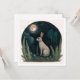 A happy rabbit sits in the moonlight in flowers and other plants with tall trees in the background.