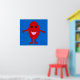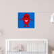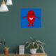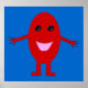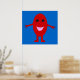 A cartoon of a smiling red grape with shiny black eyes and a pink mouth standing against a blue background with its arms open wide. This is a vibrant colourful poster that should put a smile on your face.
